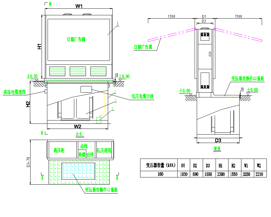【組成部分】:由高壓開(kāi)關(guān)柜、變壓器、低壓開(kāi)關(guān)柜、彩鋼板外殼組成